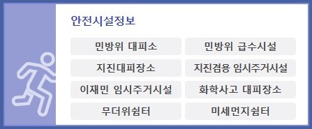 지진대피장소, 화학사고 대피장소, 무더위 쉼터, 미세먼지 쉼터 등을 검색해 볼 수 있습니다.
