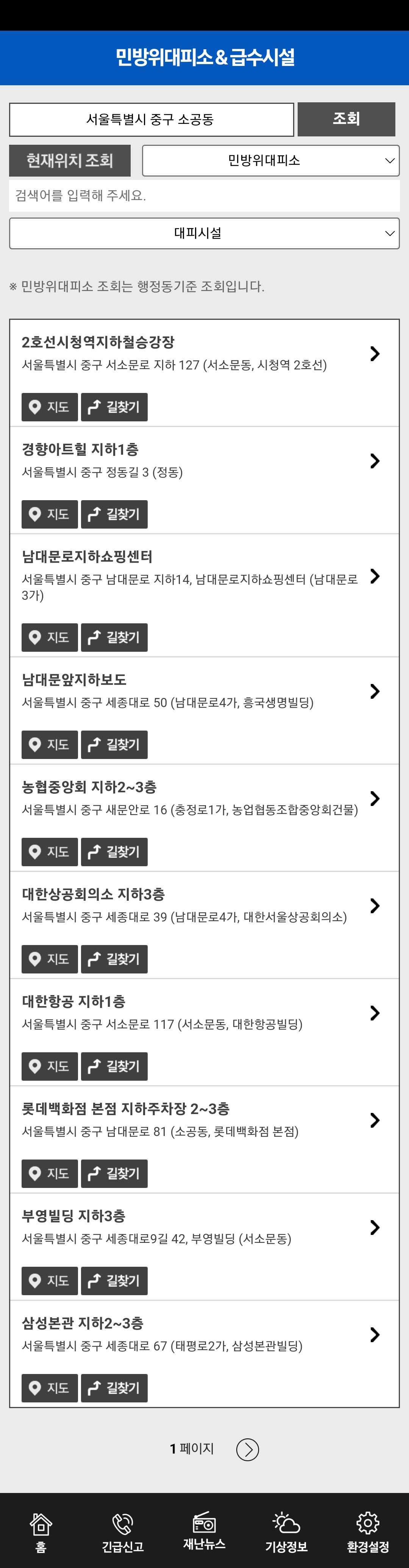 안전디딤돌 앱에서 서울 중구 소공동 민방위 대피소를 검색해 봤습니다.