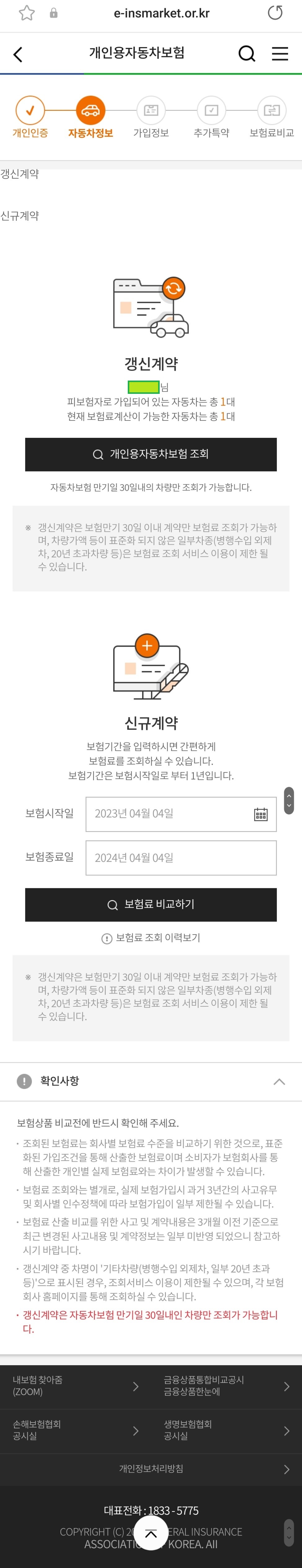 이 때 "갱신계약은 자동차보험 만기일 30일이내인 차량만 조회가 가능합니다."